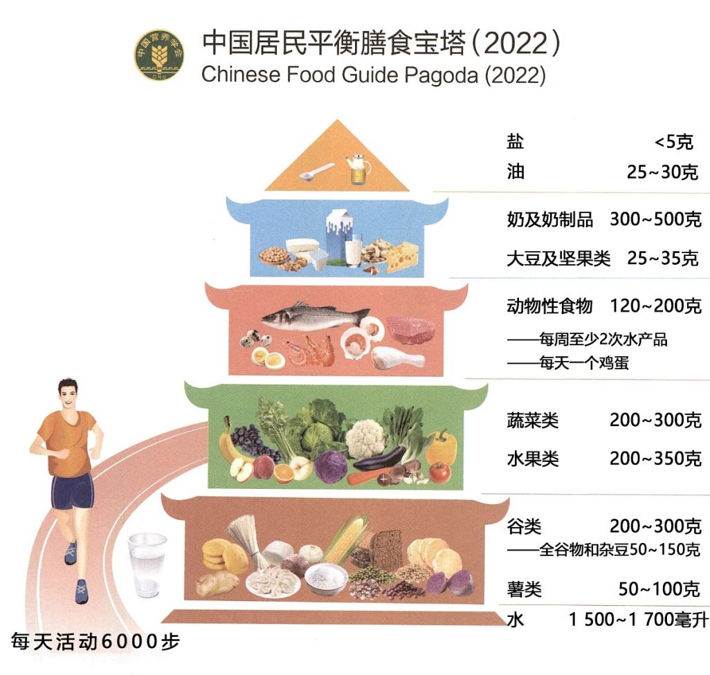 如果將每天食物的攝取量形象地比喻為寶塔結(jié)構(gòu),從下往上分別應(yīng)是谷類200~300g(包括全谷物和雜糧50~150g)和薯類50~100g、水果類200~350g、蔬菜類300~500g、動(dòng)物性食物120~200g、奶及奶制品300~500g、大豆及